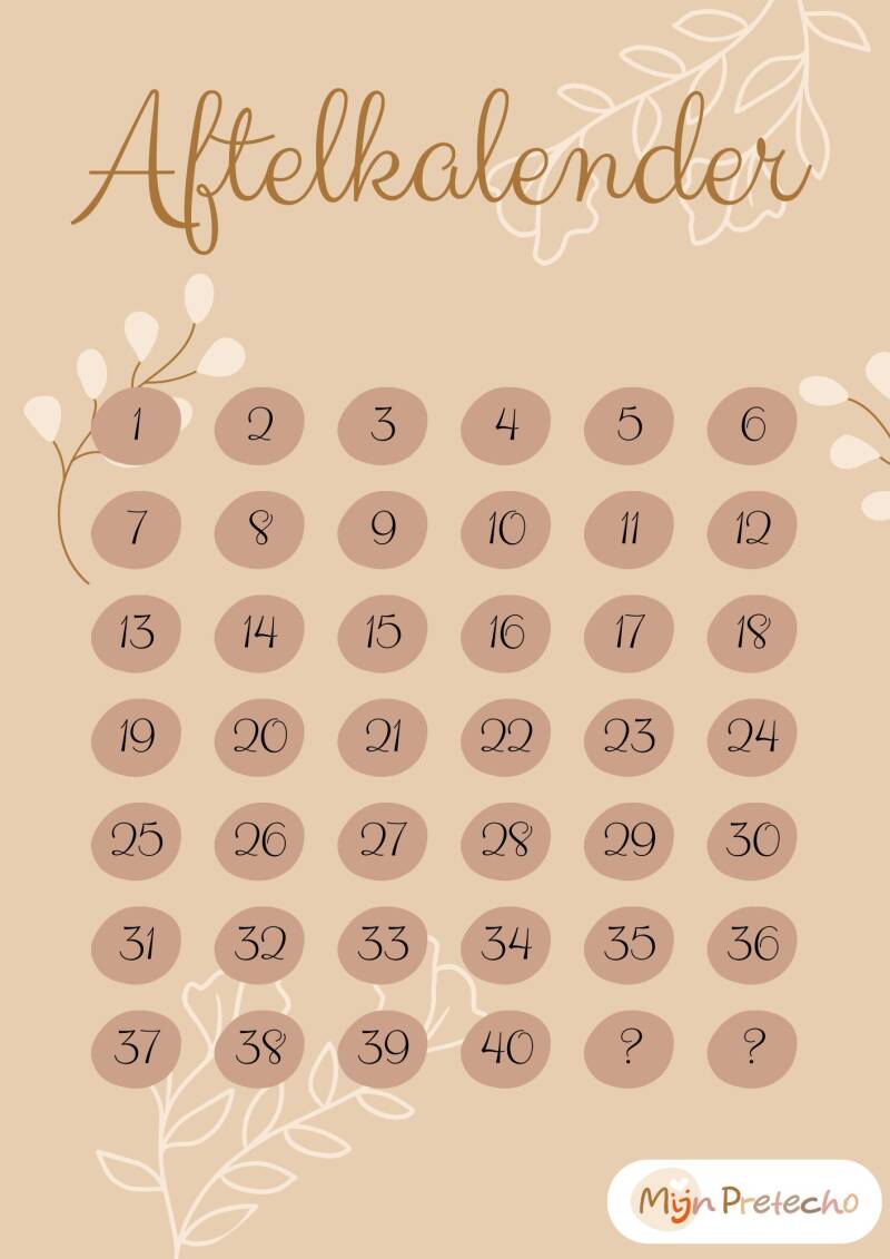 Print uit, plak op de koelkast en streep iedere week weer een hokje weg. Zo tel je makkelijk af naar de geboorte van jullie baby.